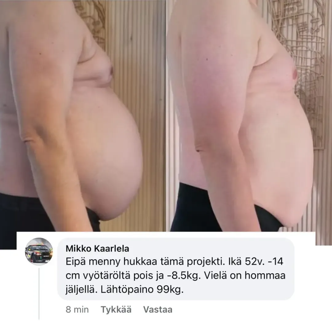 "Ruokavalion perusteellinen läpikäynti ja sen mahdollinen säätäminen oli loistava. Jos mulle ois lyöty lappukouraan ilman selityksiä ja 80/20 mahdollisuutta niin sinne ois jääny aika pian. Tästä tulee varmasti ainakin mulle pidempi aikaisempi juttu, kun mahdollisuus säätää on ja se on jopa ”luvallista”."