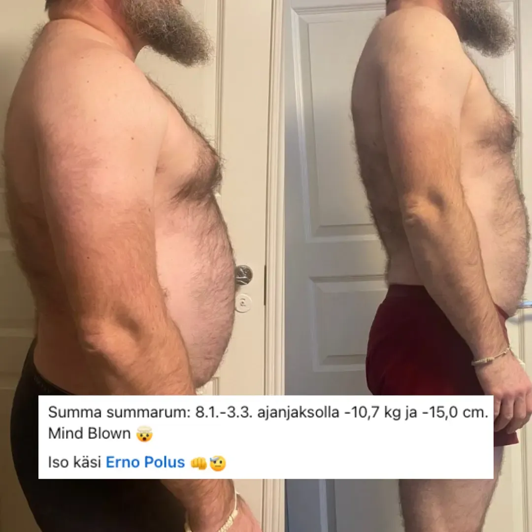 ”Ernon valmennuksen avulla pitkään jatkunut Mä teen ne vatsat huomenna -selittelyn jälkeen on alkanut myös tapahtumaan. Tuloksia on syntynyt niin kehonkoostumuksen kuin suorituskyvynkin puolella”